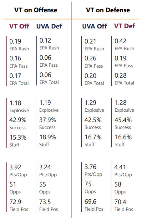 Virginia Tech’s opponents have been able to nickel-and-dime the defense, methodically driving the length of the field without the aid of a big play. In theory, Virginia could do this too, but that success rate, which at 42.5% unadjusted is actually lower than Virginia Tech’s, suggests that consistency could be an issue.