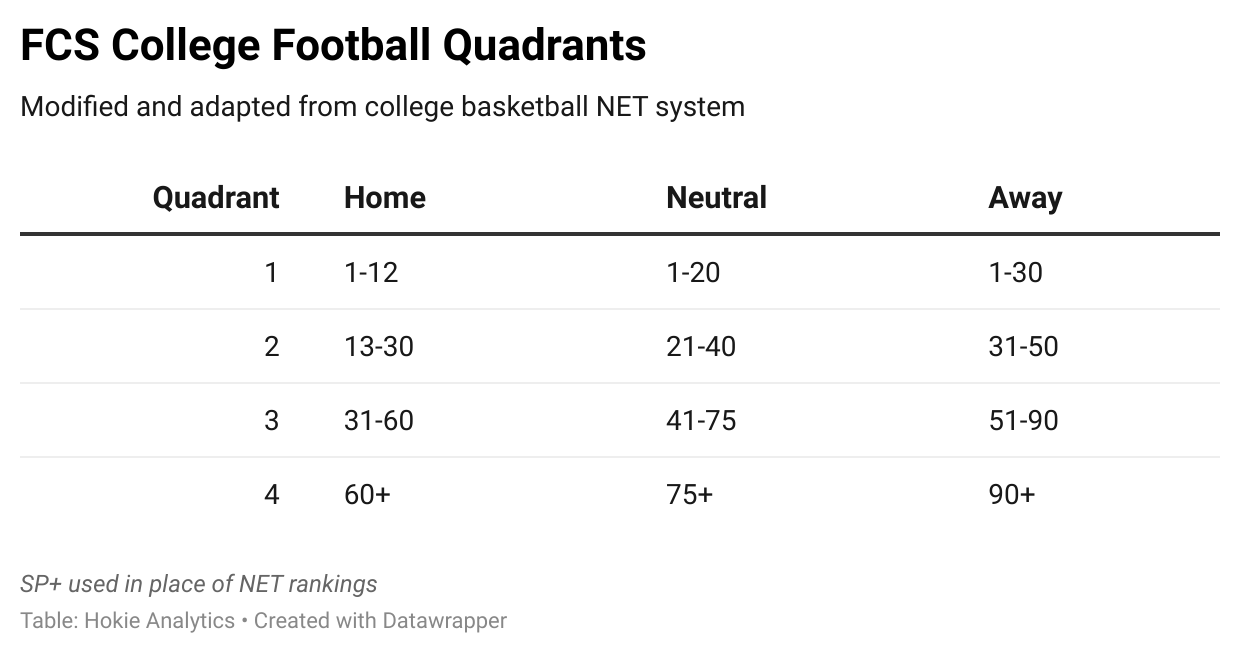 In an attempt to bring some quantitative rigor to bear, I modified the college basketball quadrant system, adapting it for college football.
