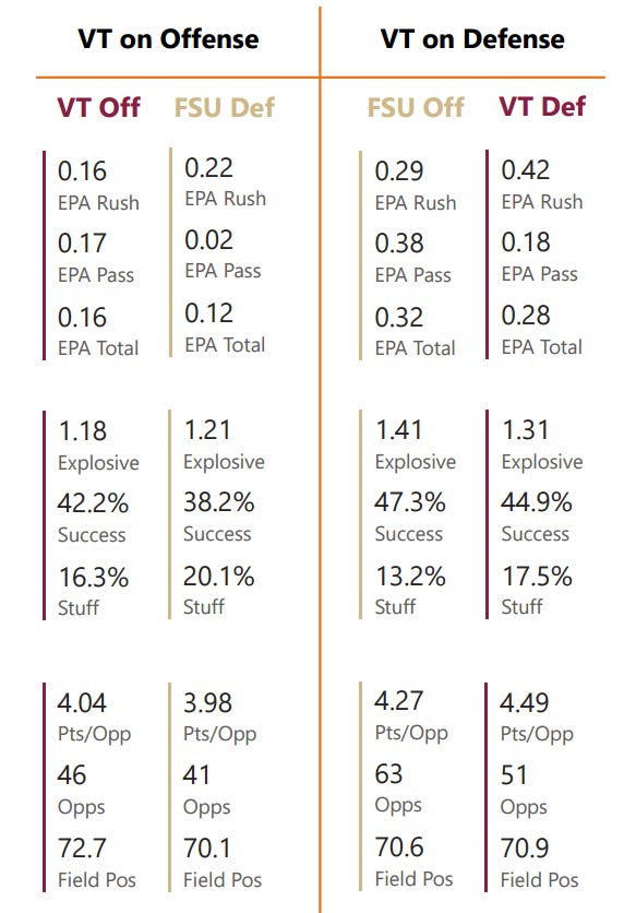 In order to present as rich a picture as possible, first I’ll tackle the advanced stats, then I’ll break down the two versions of Florida St. that could face Virginia Tech.