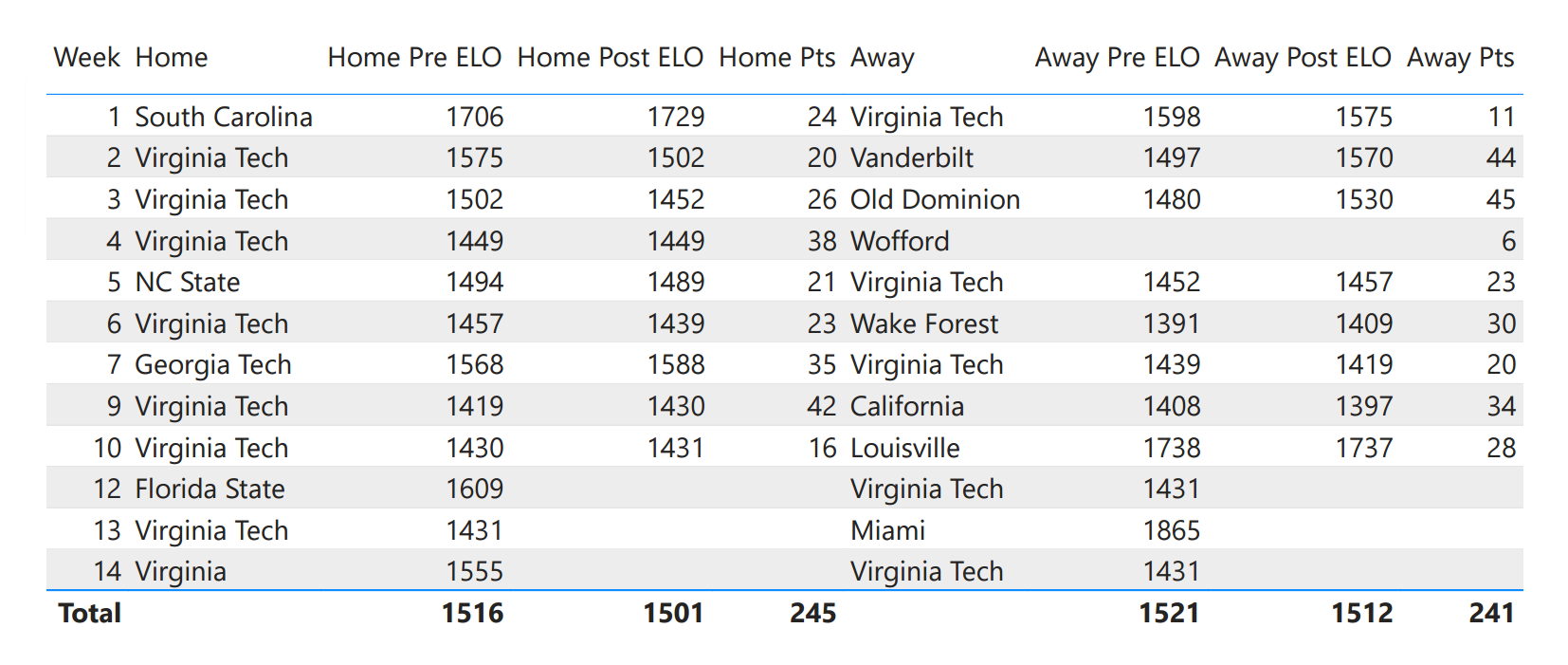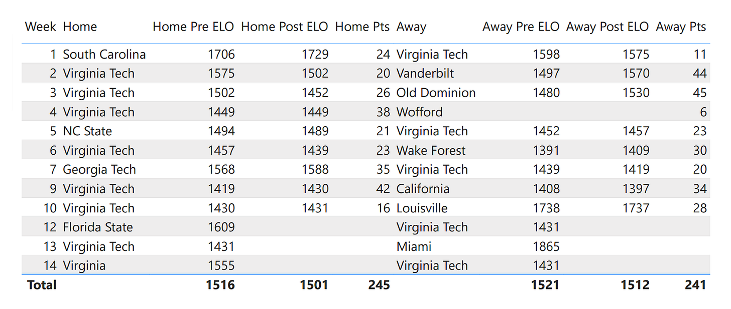 In ELO terms, a 1500 rating roughly corresponds to a 6-6 power conference team. Every additional 100 rating points add a win and subtract a loss. So, just looking at ELO, Florida St. is roughly a 7-5 level team, while the Hokies are a 5-7 level team.